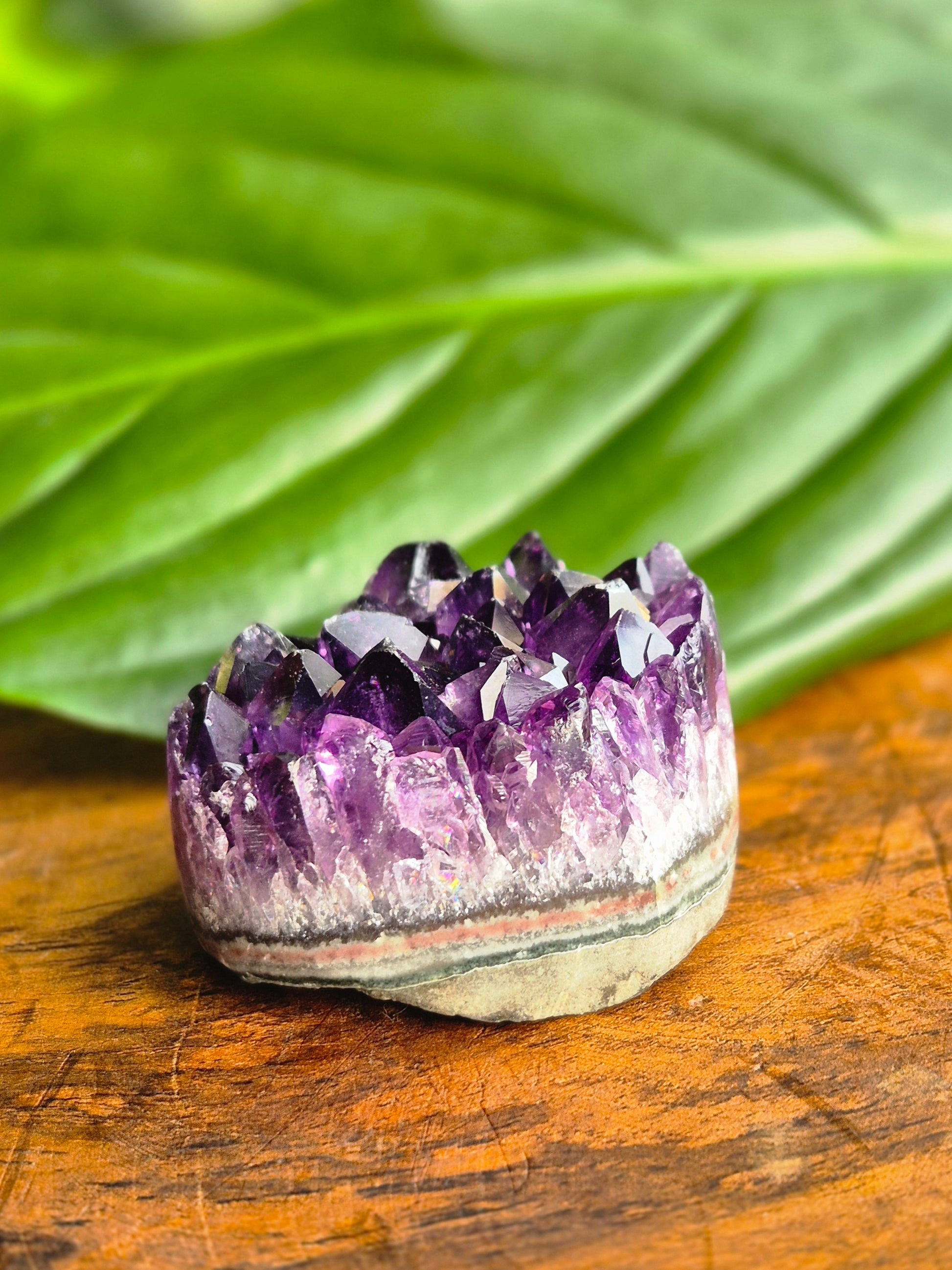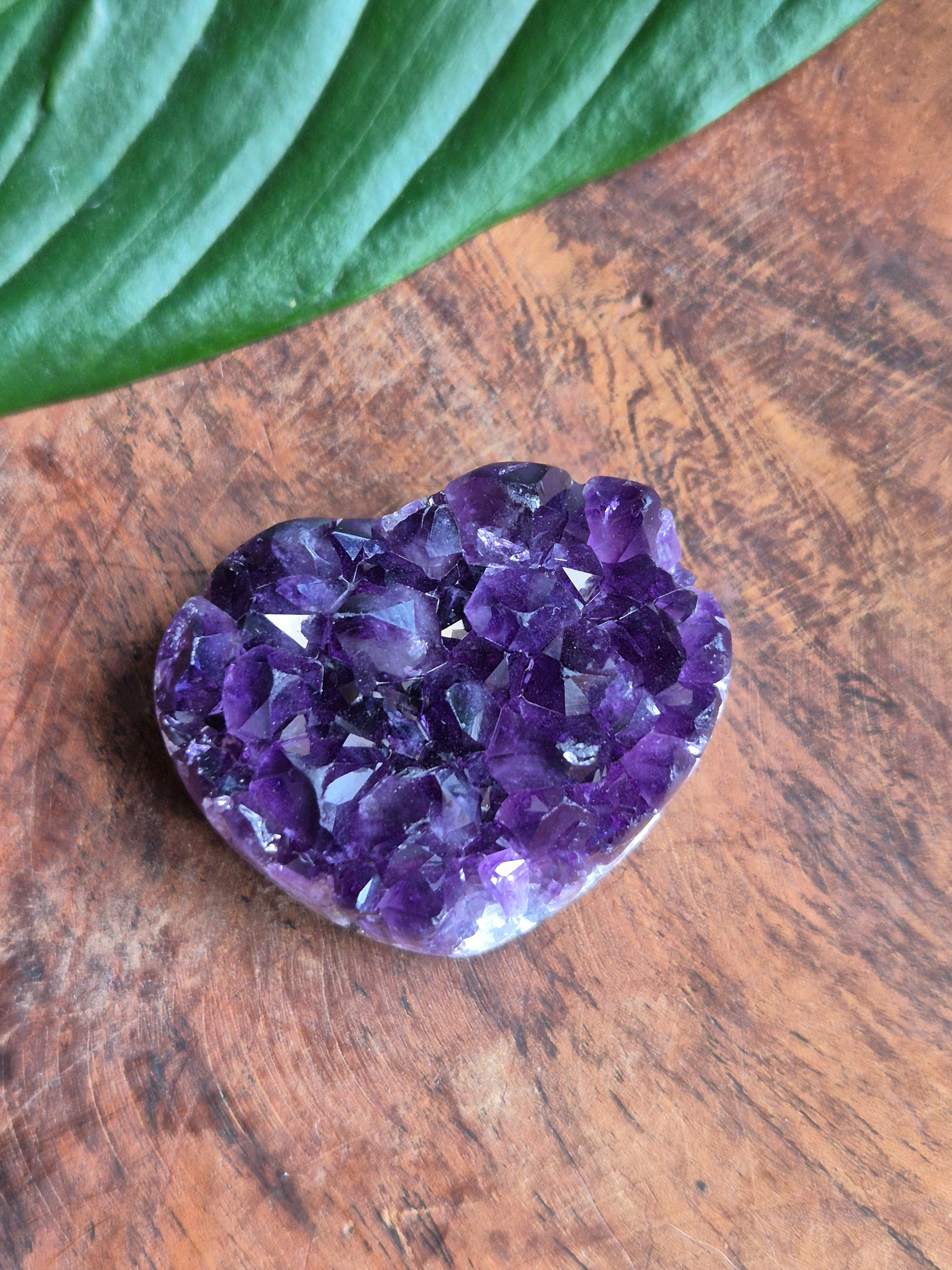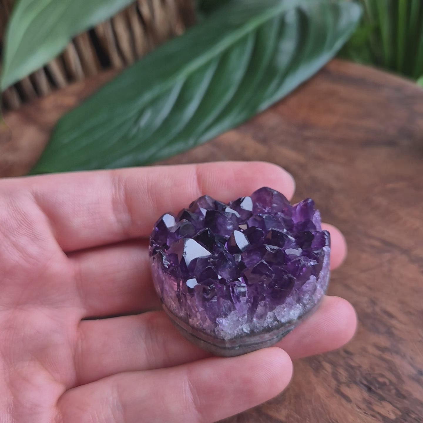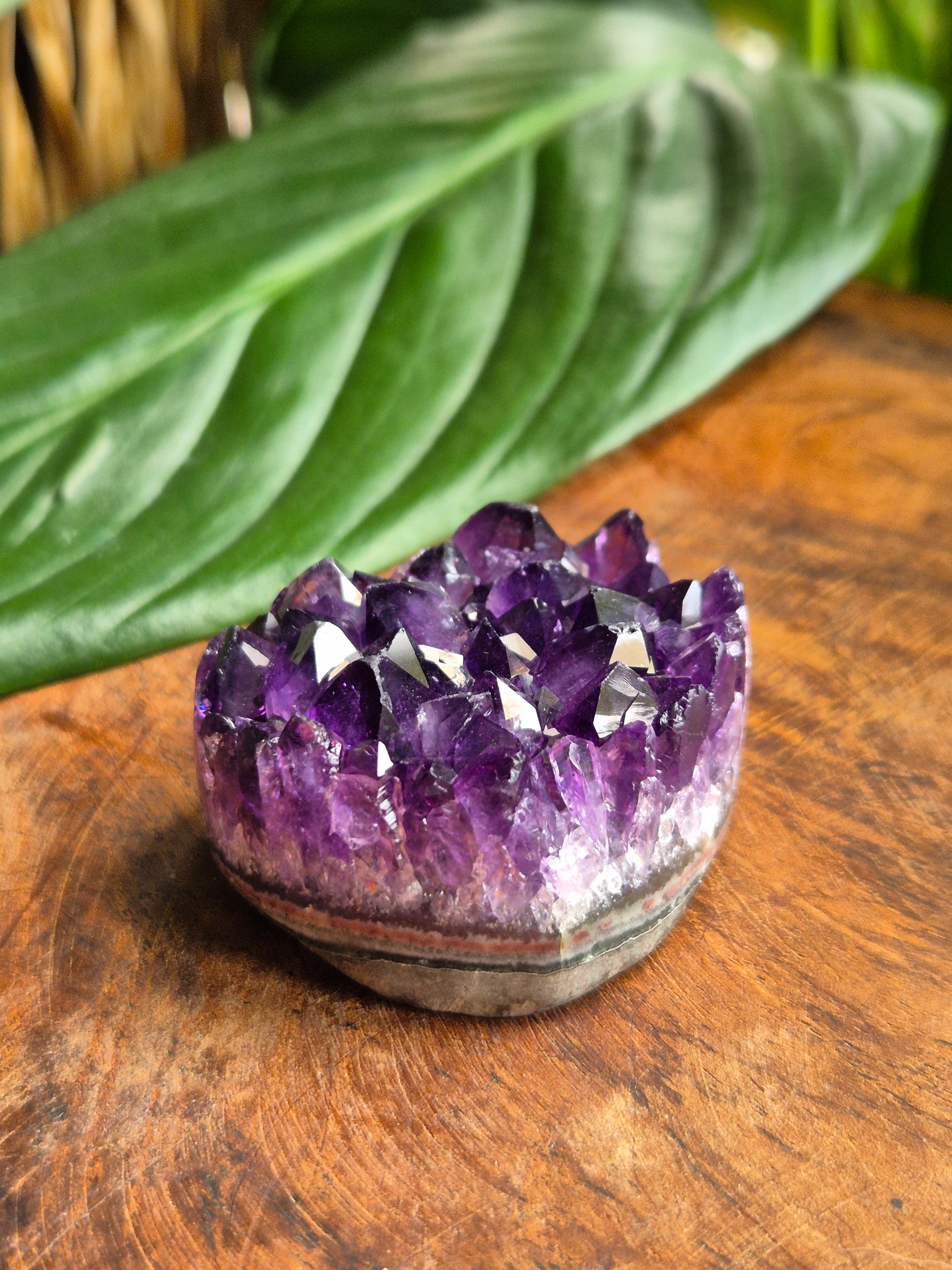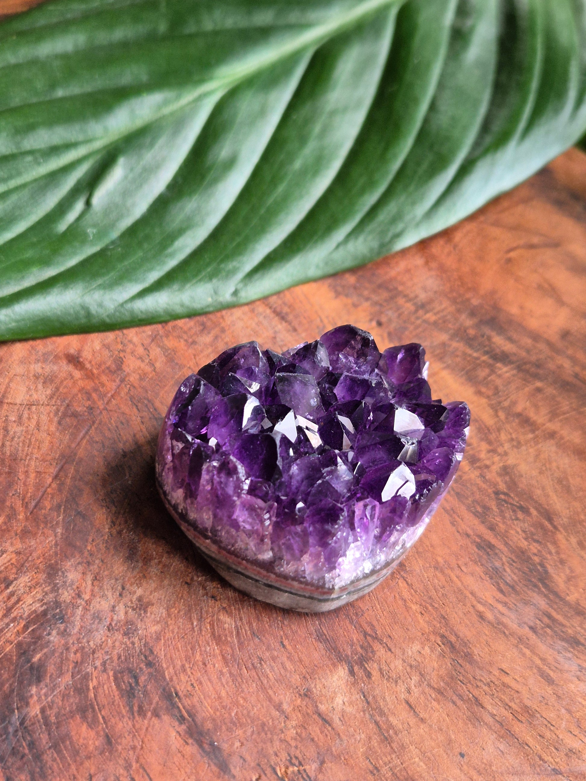 Amethyste gehören zur Familie der Quarze. Hier handelt es sich um eine tiefviolette Druse aus Brasilien, welche besonders wertvoll und begehrt sind. Umso dunkelvioletter und klarer die Steine sind, umso stärker sind auch die Heilwirkungen. Drusen sind Hohlräume, in denen Amethyste gewachsen sind. Druse und Stücke davon werden erfolgreich zur Raumharmonisierung, energetischen Reinigung und zum Reinigen und Aufladen von anderen Heilsteinen verwendet. Du kannst hier also deine Schmuckstücke auflegen und so wieder reinigen und energetisieren.