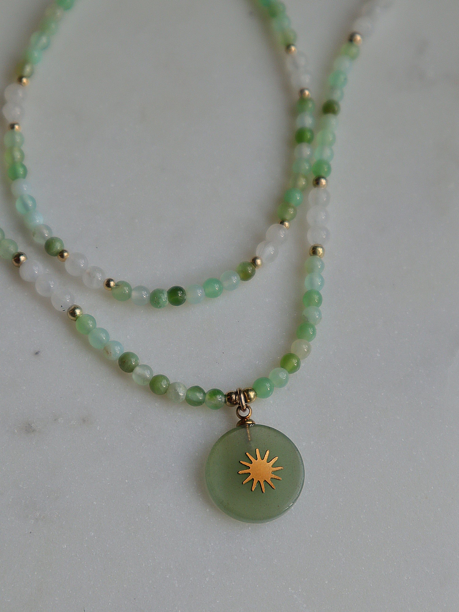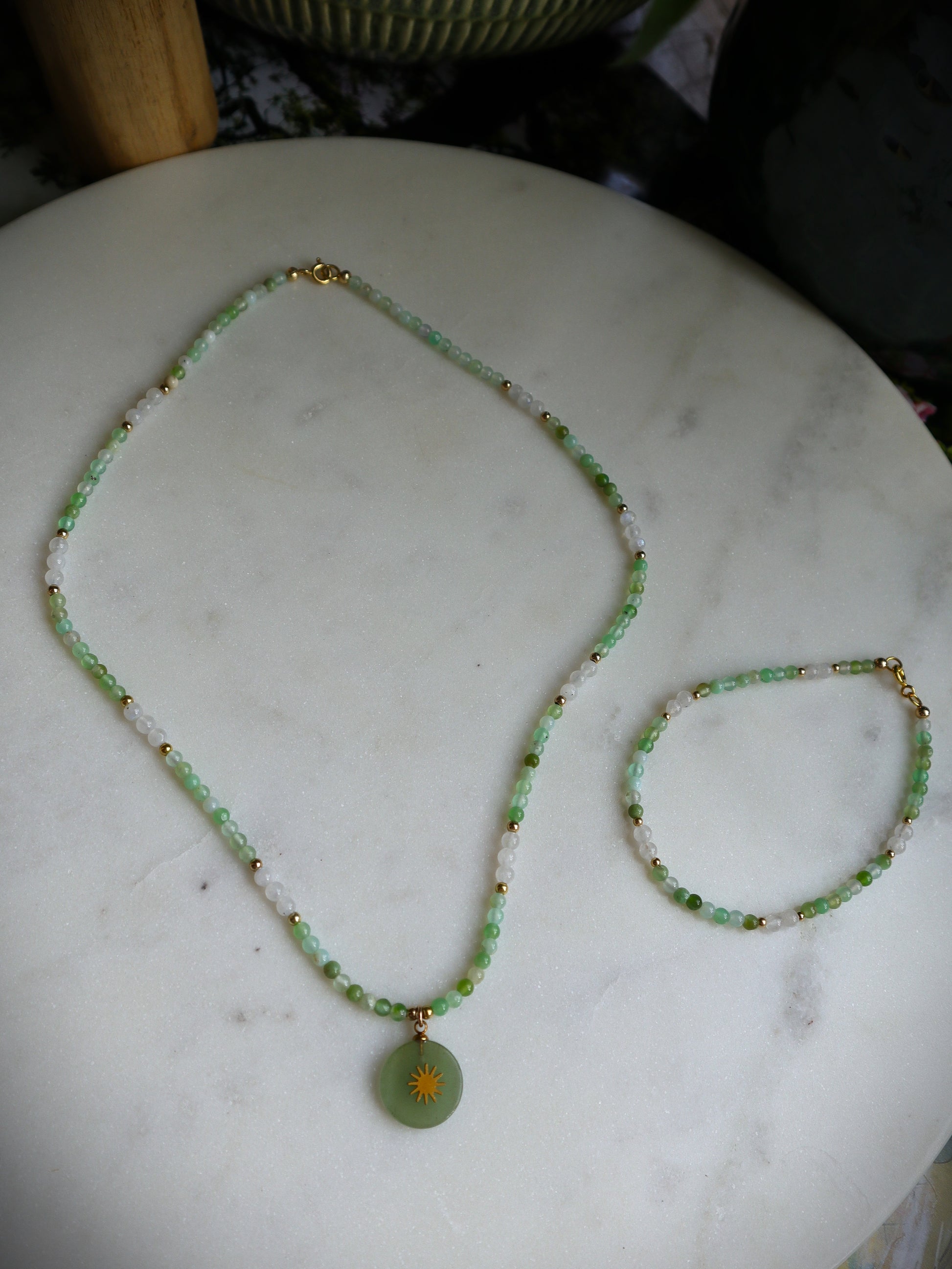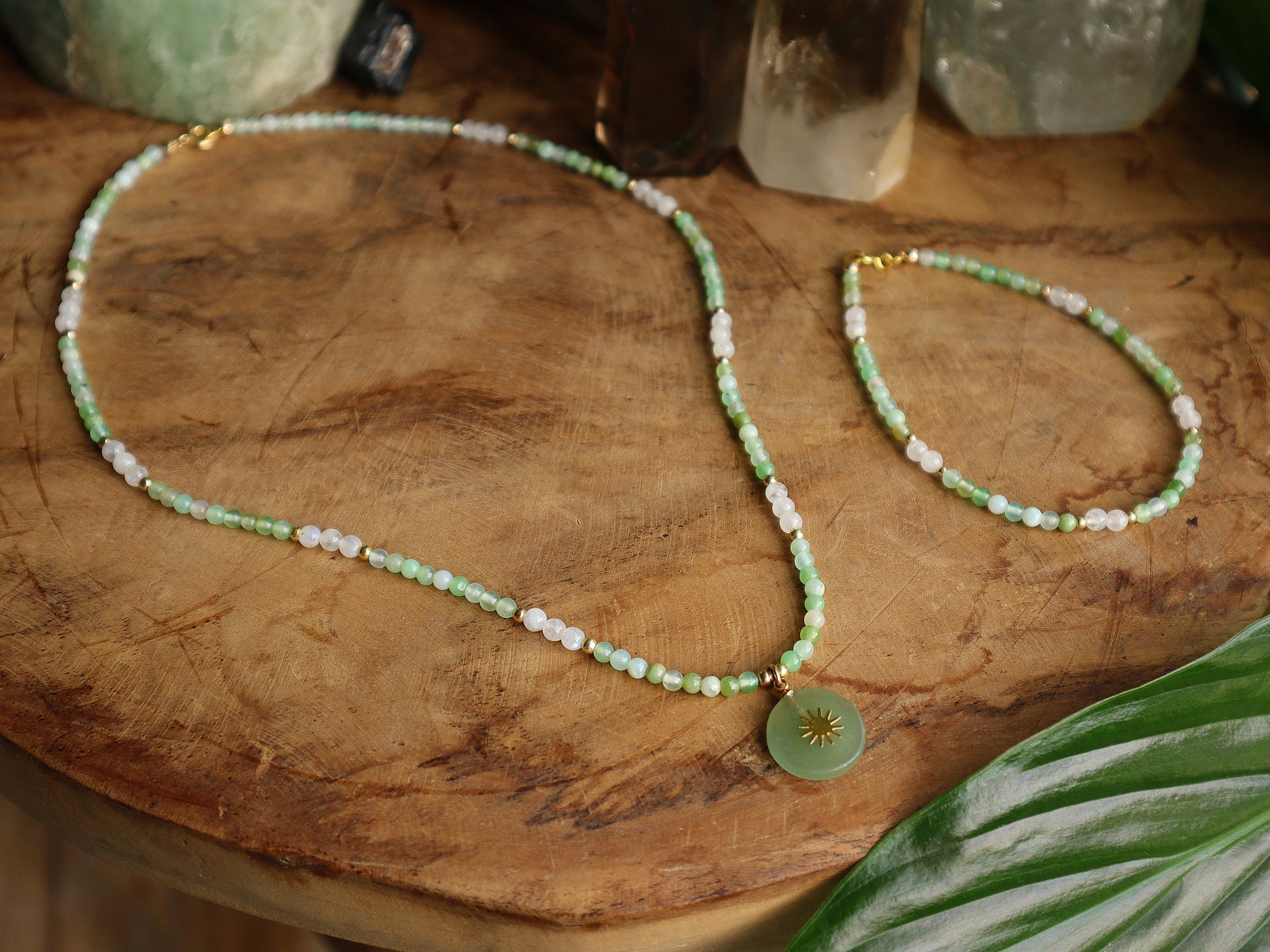 Armband und Halskette aus Aventurin Perlen, Anhänger aus Aventurin mit Sonne und 14 k vergoldeten Sterling Silber Elementen