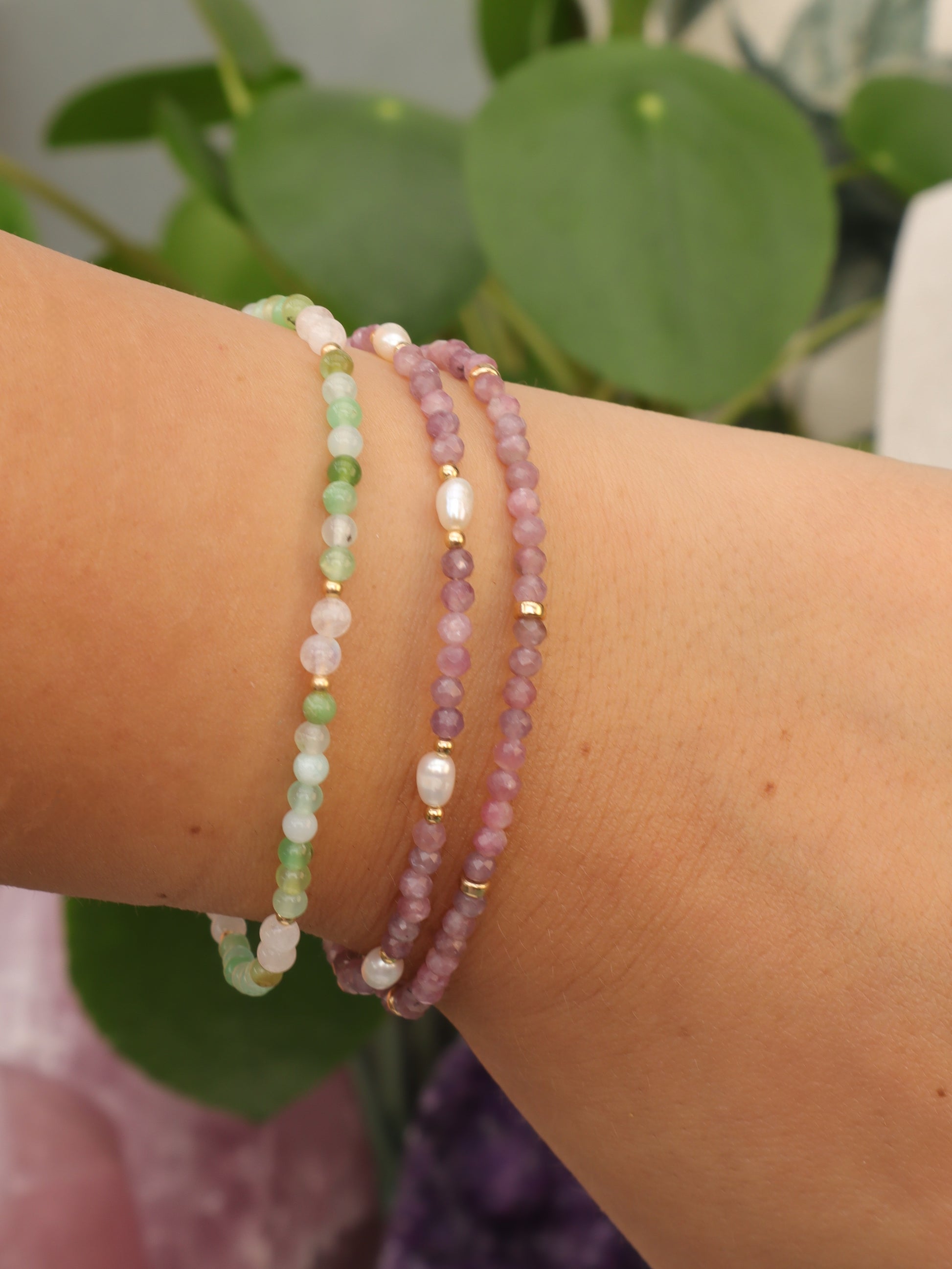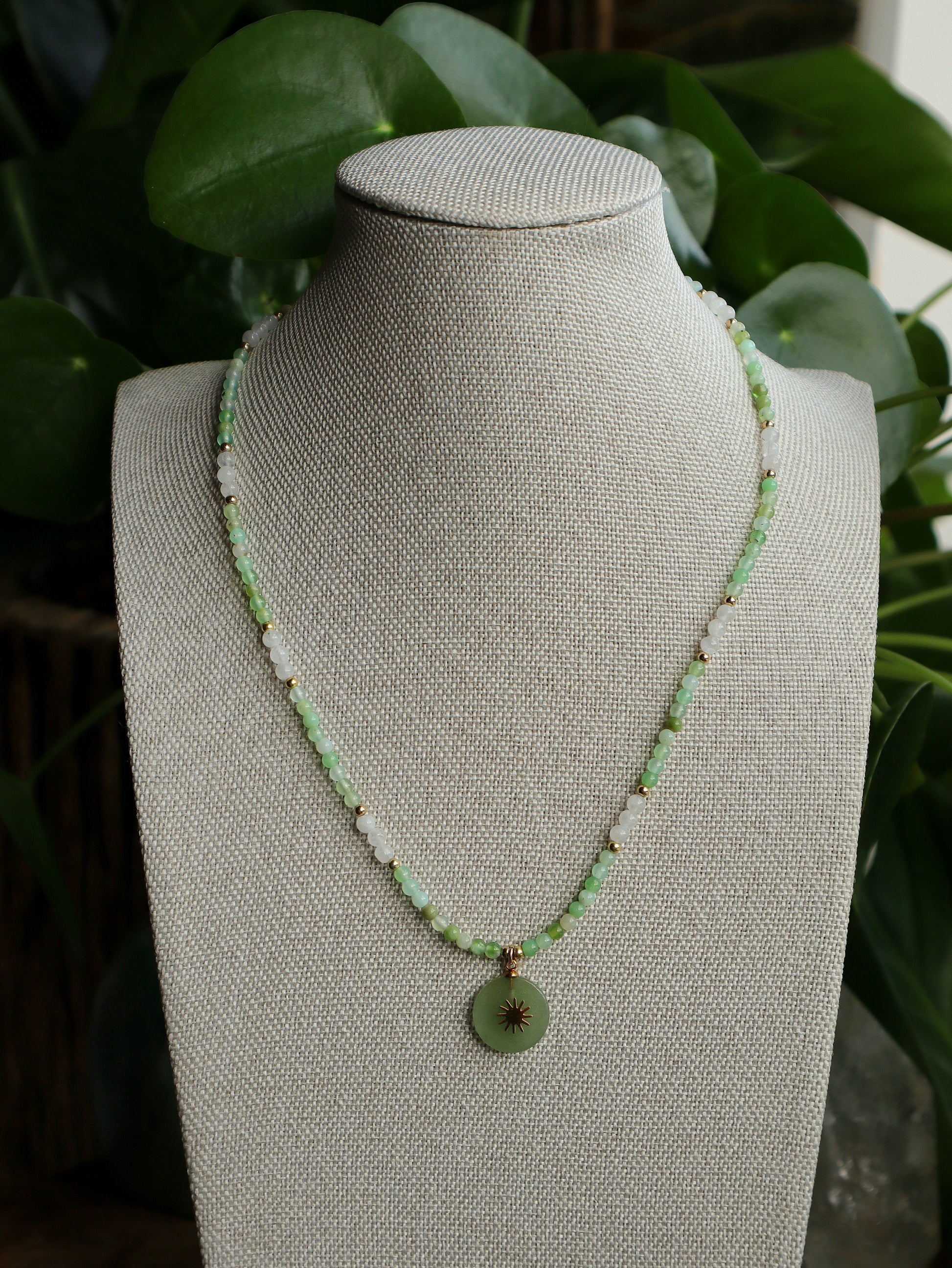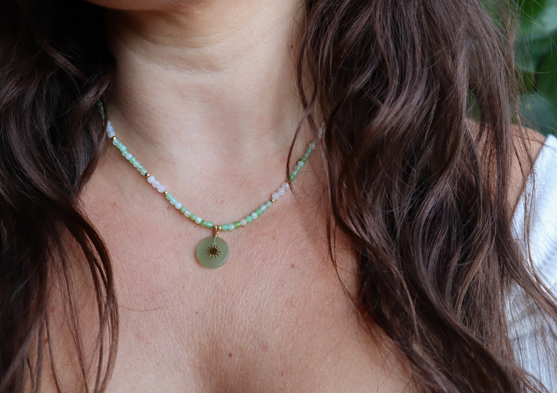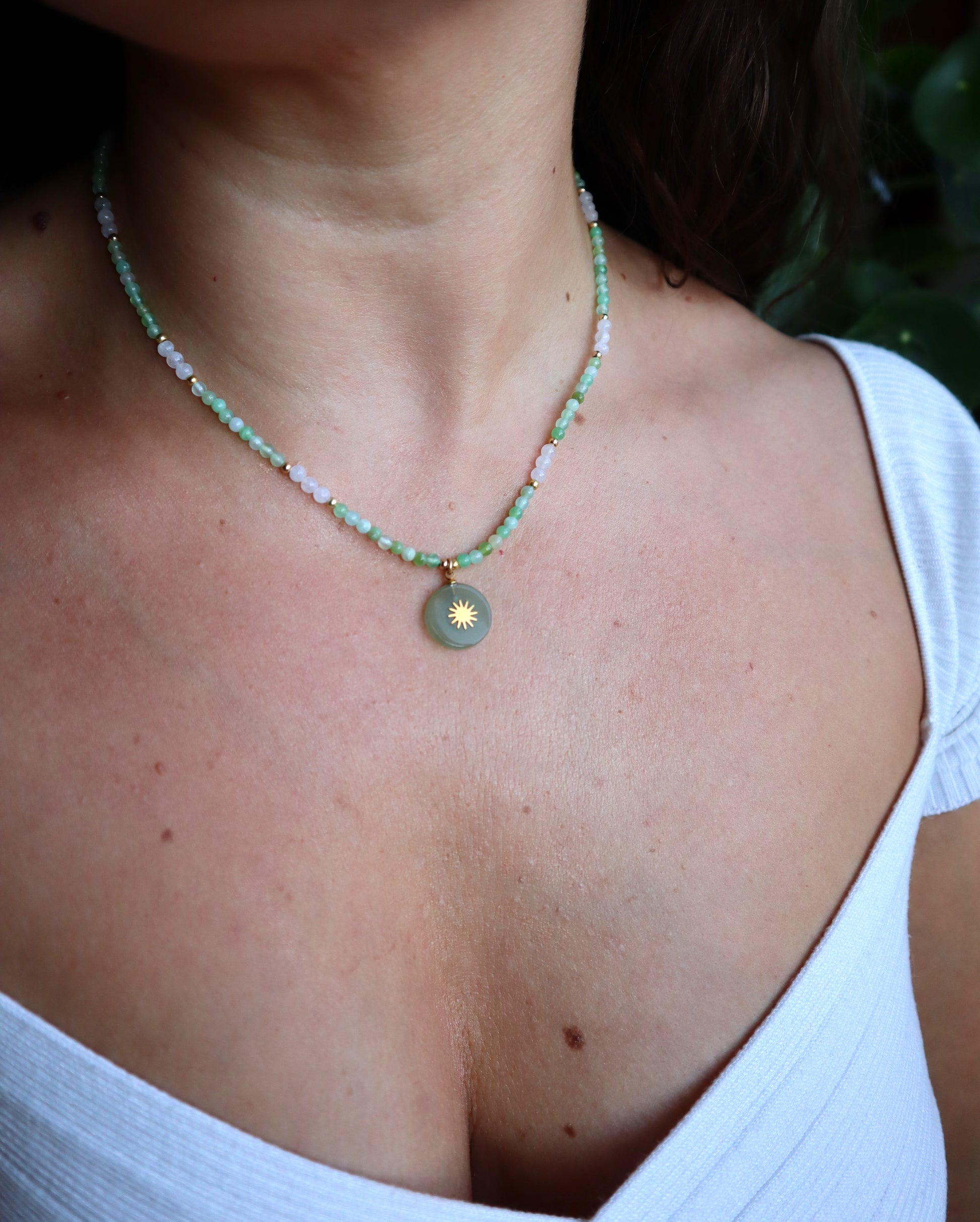 Armband und Halskette aus Aventurin Perlen, Anhänger aus Aventurin mit Sonne und 14 k vergoldeten Sterling Silber Elementen