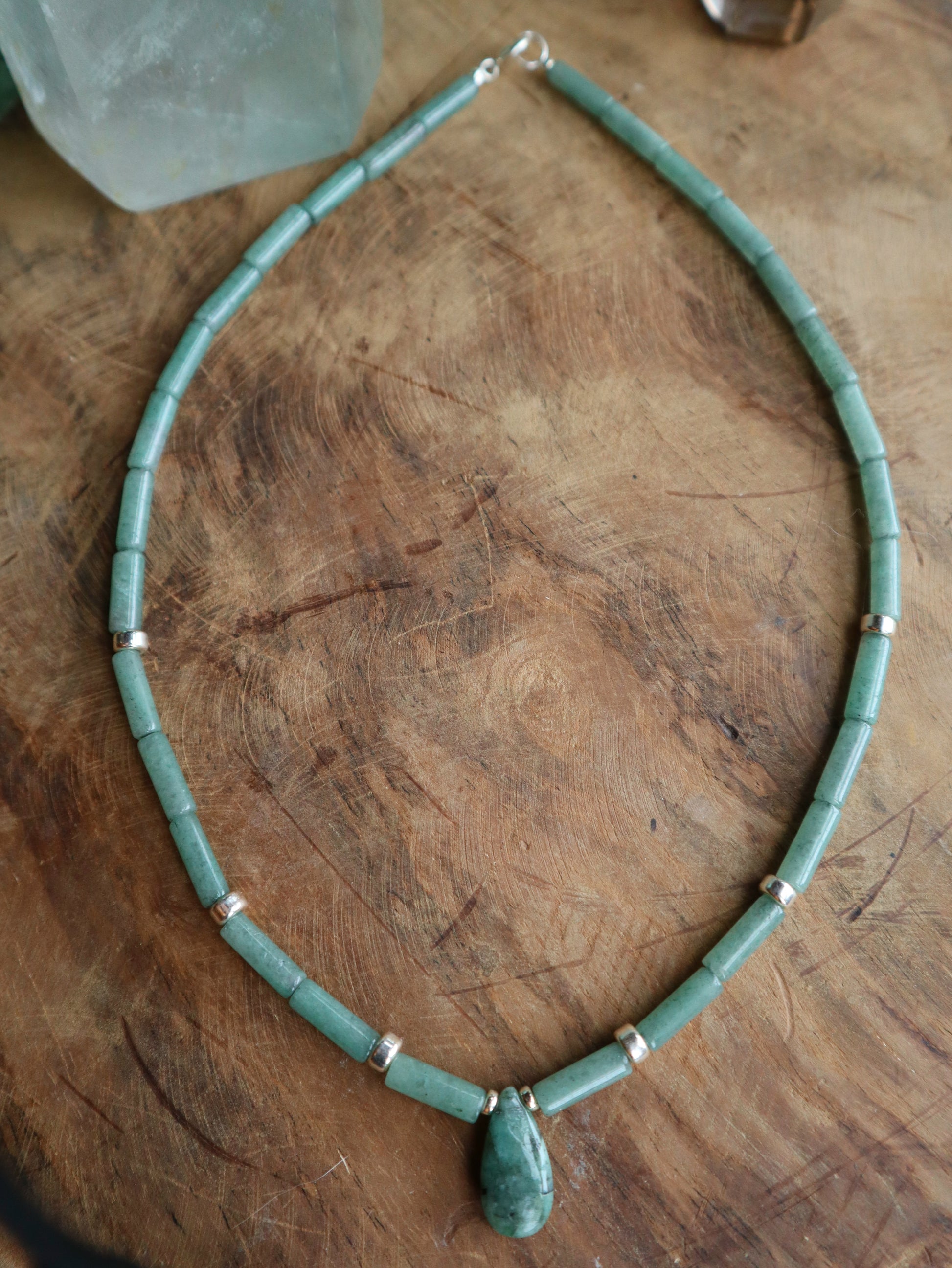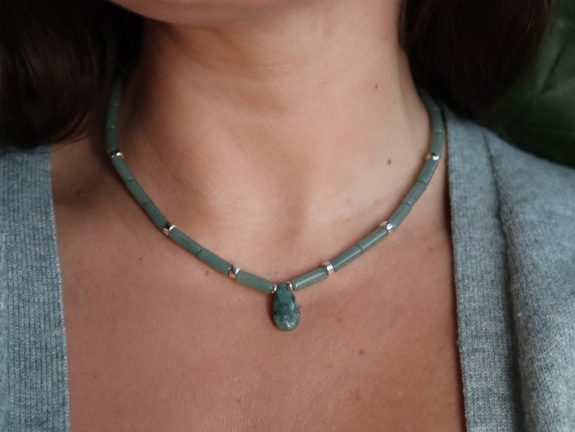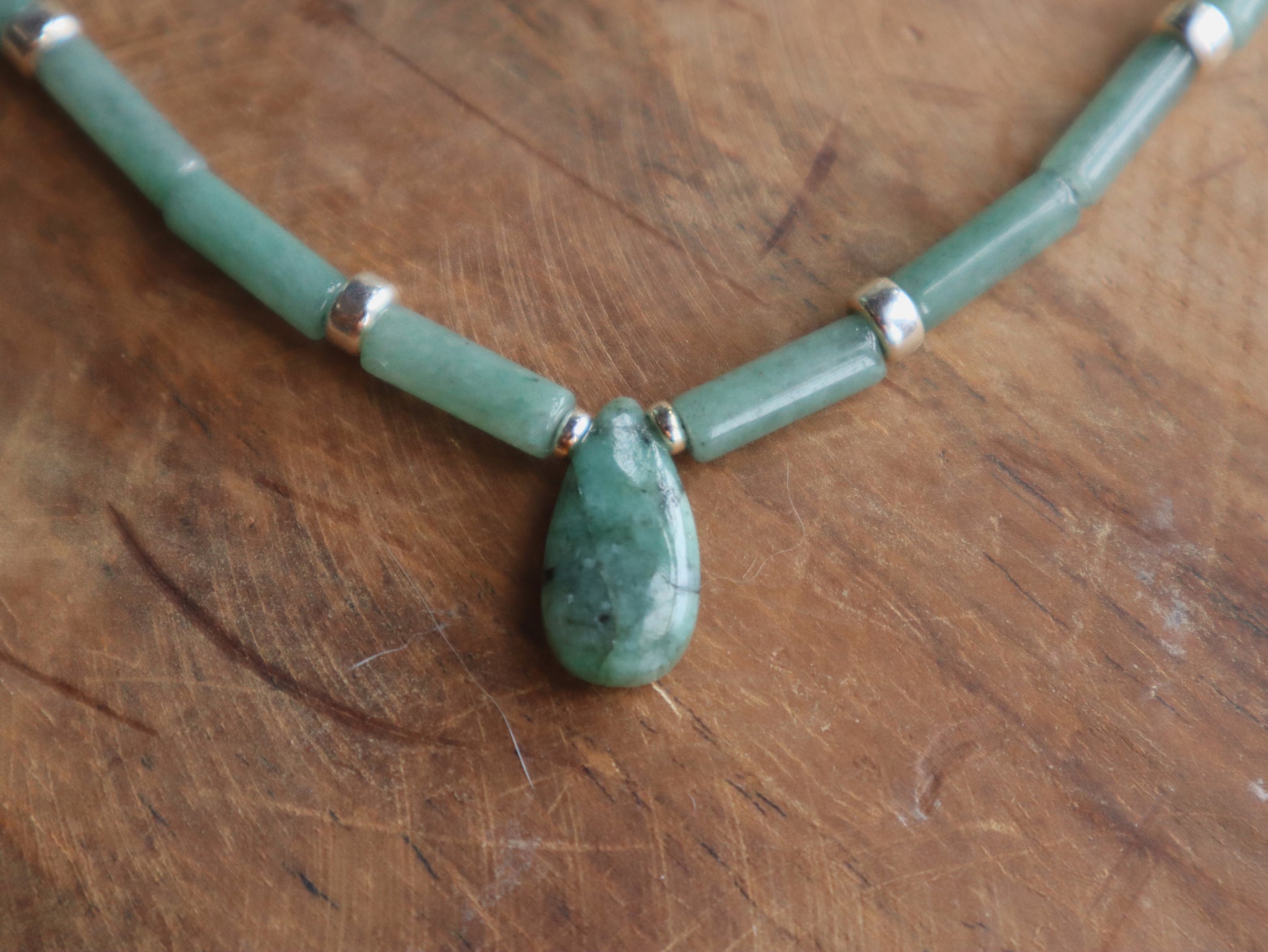 Aventurin Kette mit Smaragd Anhänger, Länge = 43 cm, alle Elemente aus 925 Sterling Silber, Einzelstück!