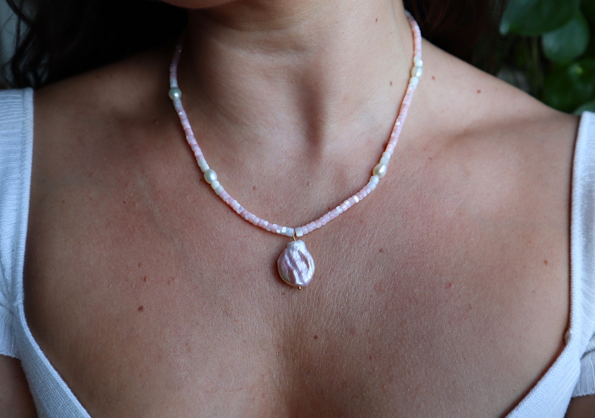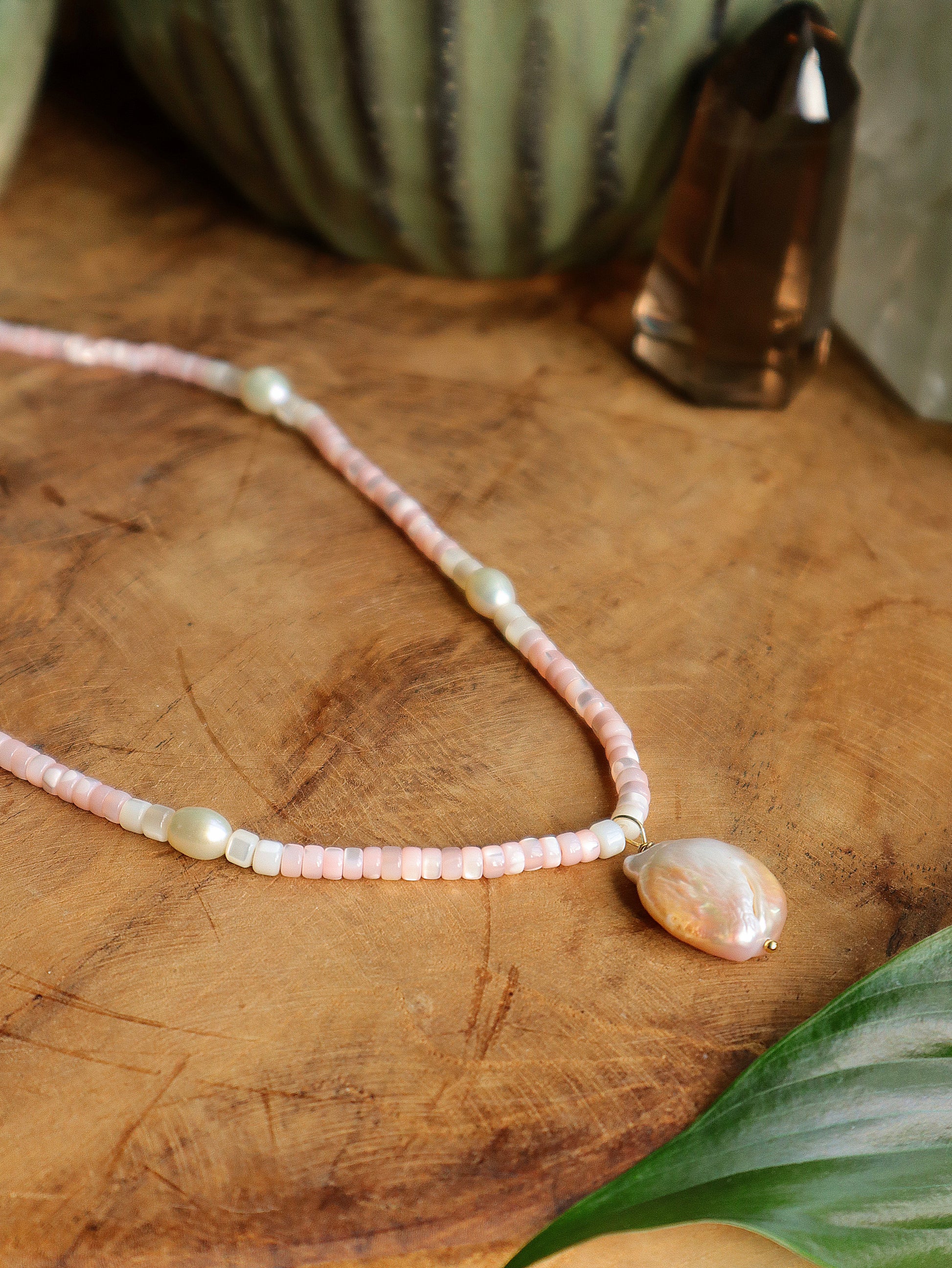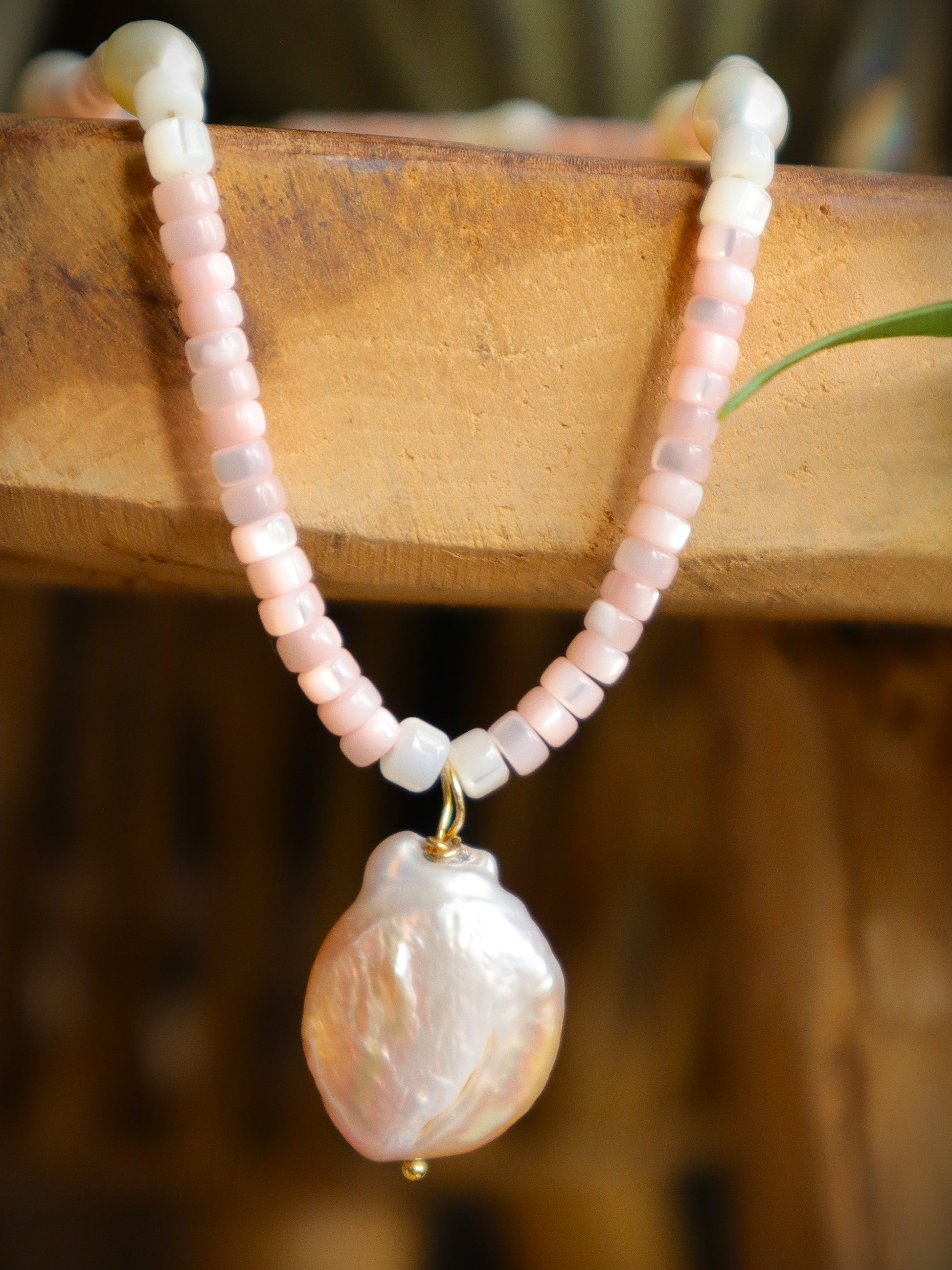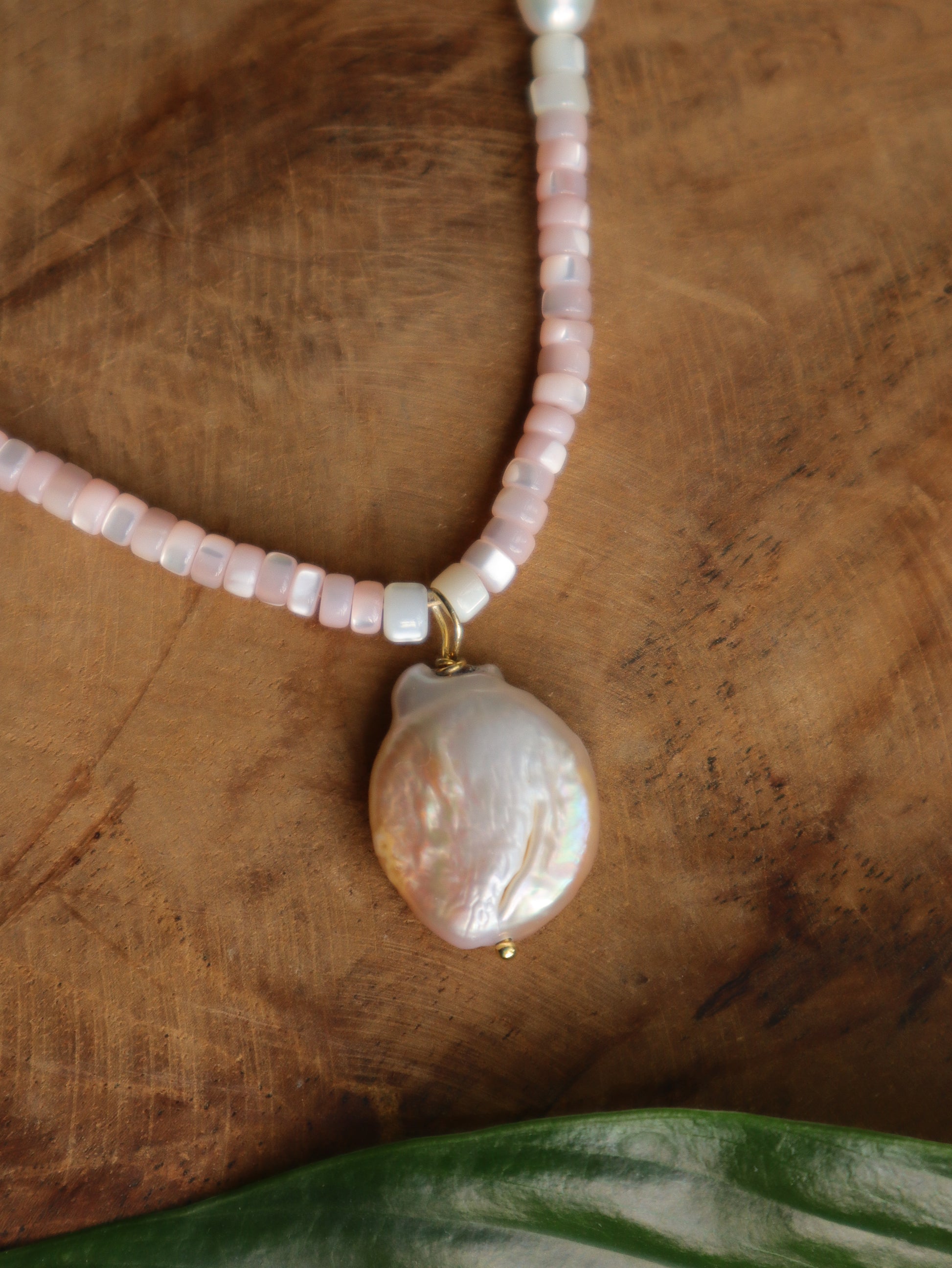 Halskette aus rosè-farbenen Muschelkernperlen, Süßwasserperlen und großem natürlichen Barockperlenanhänger (2 cm), Länge = 43,5 cm + Verlängerungskettchen 5 cm