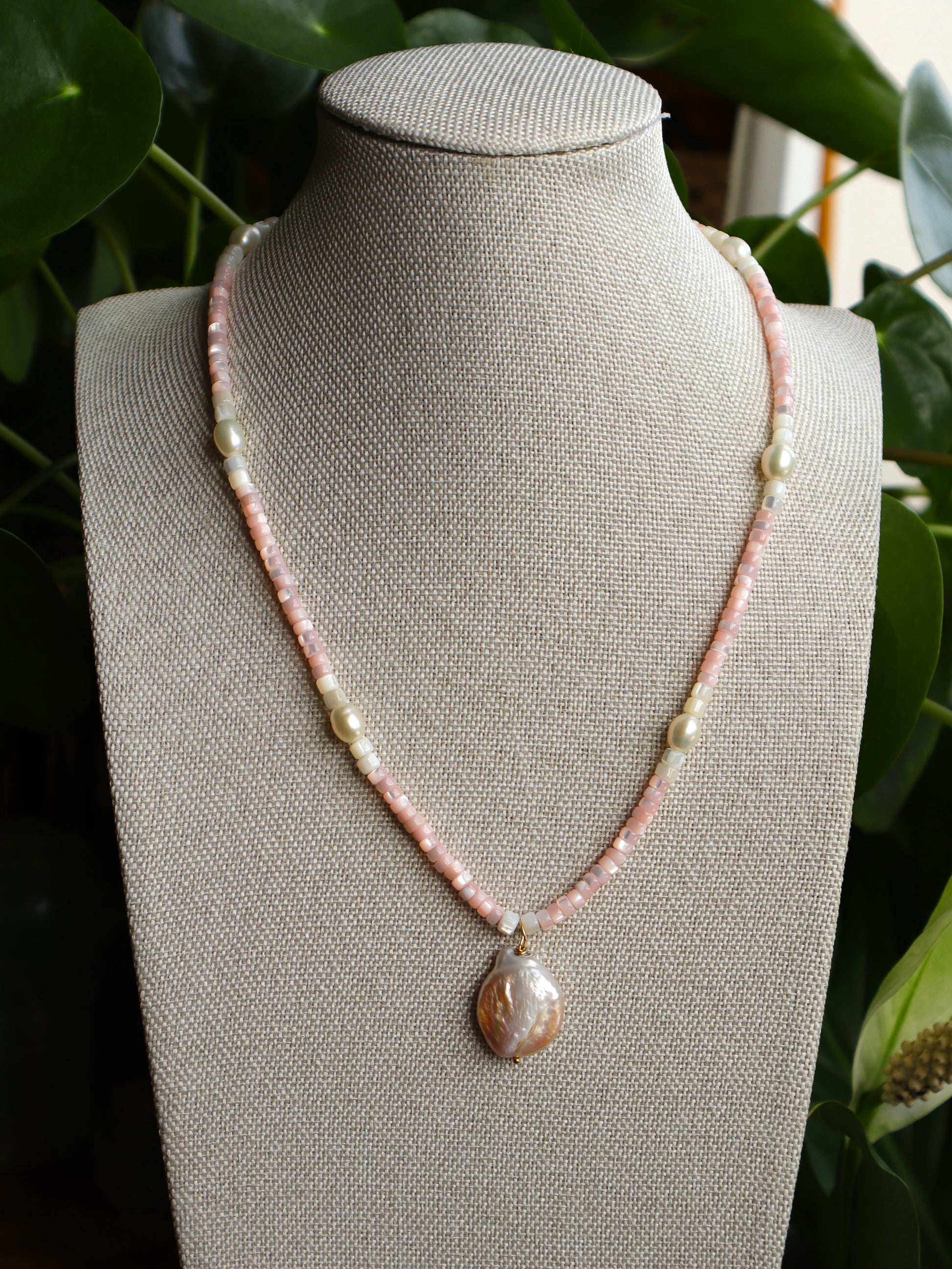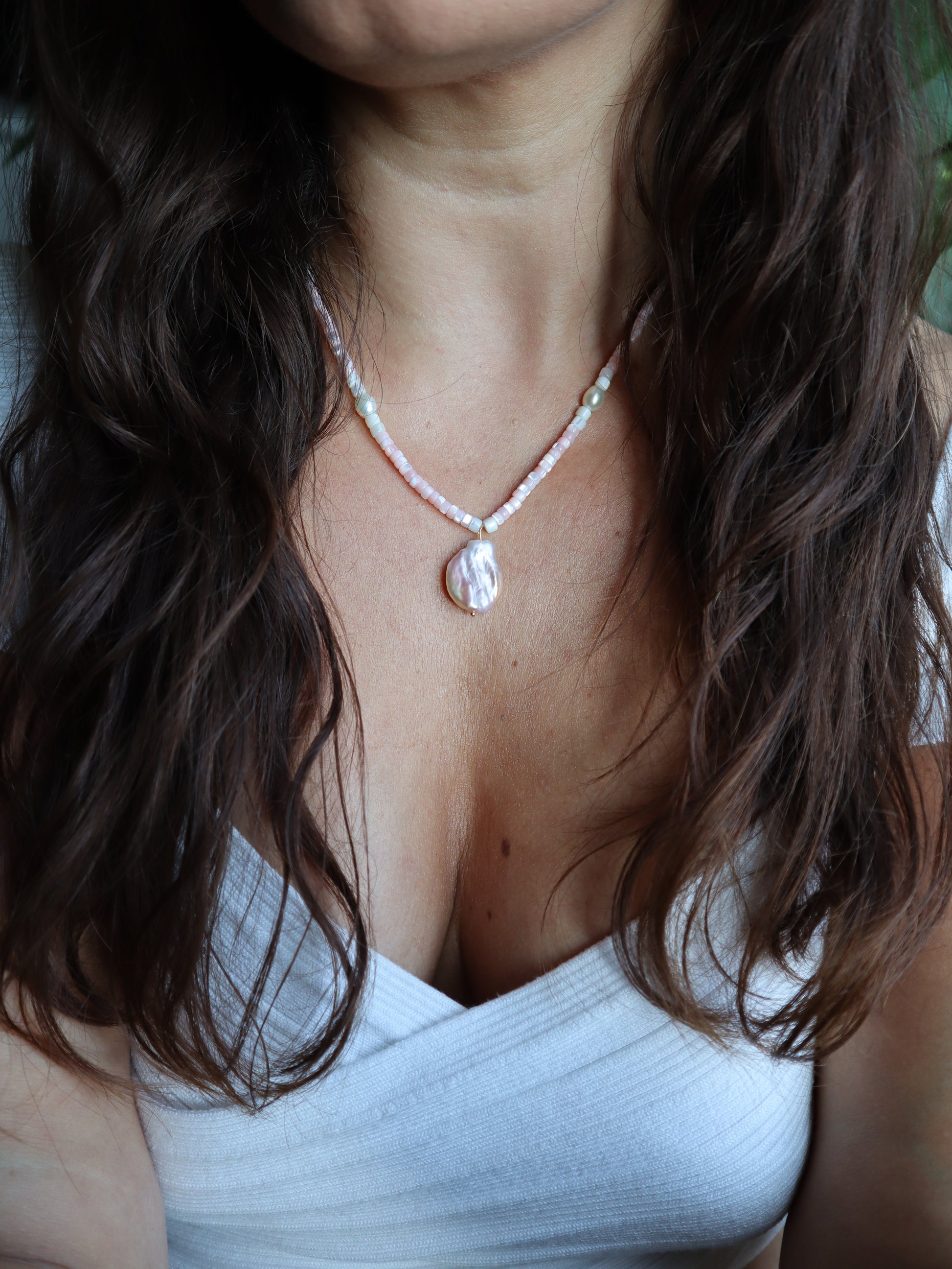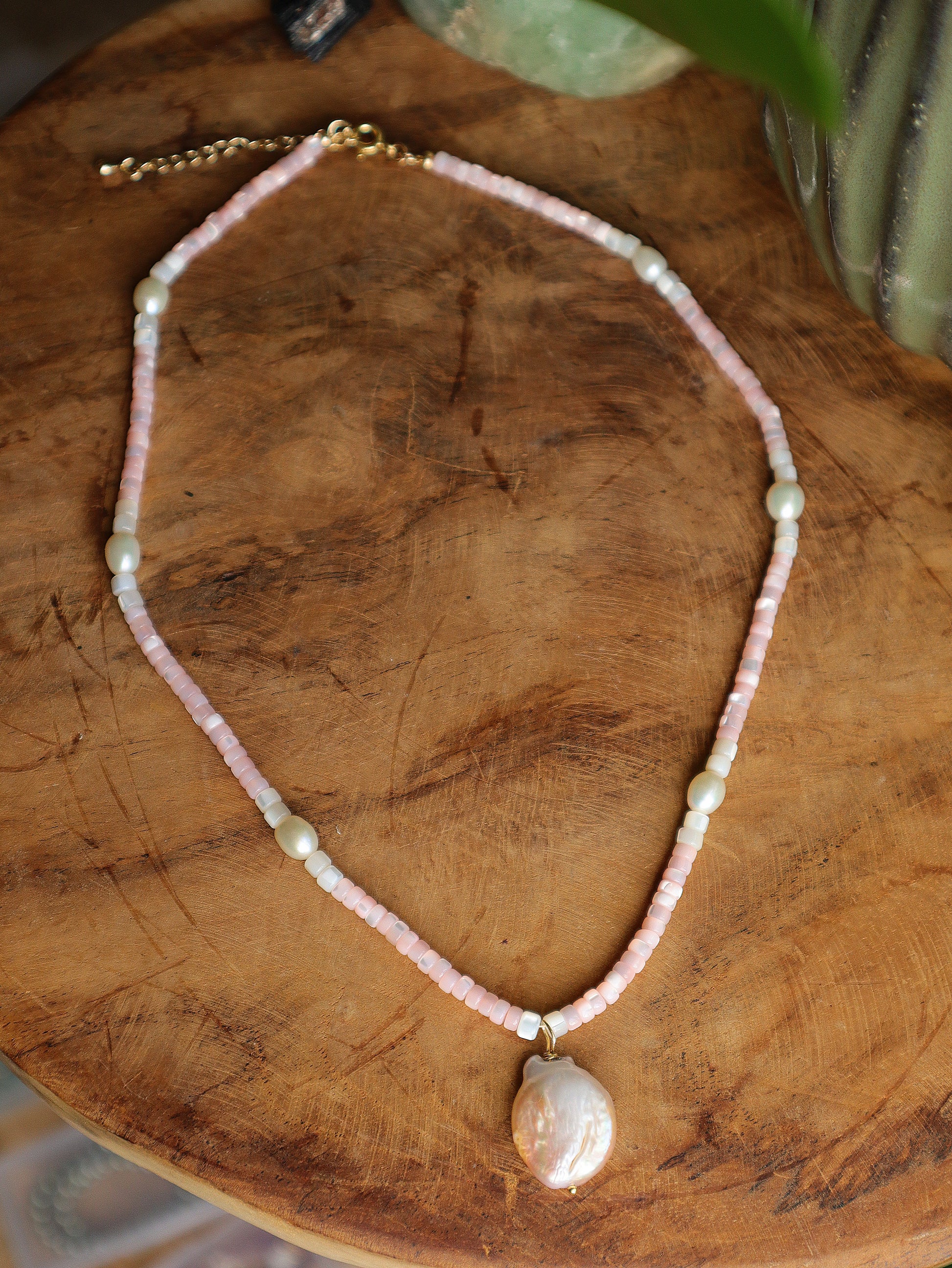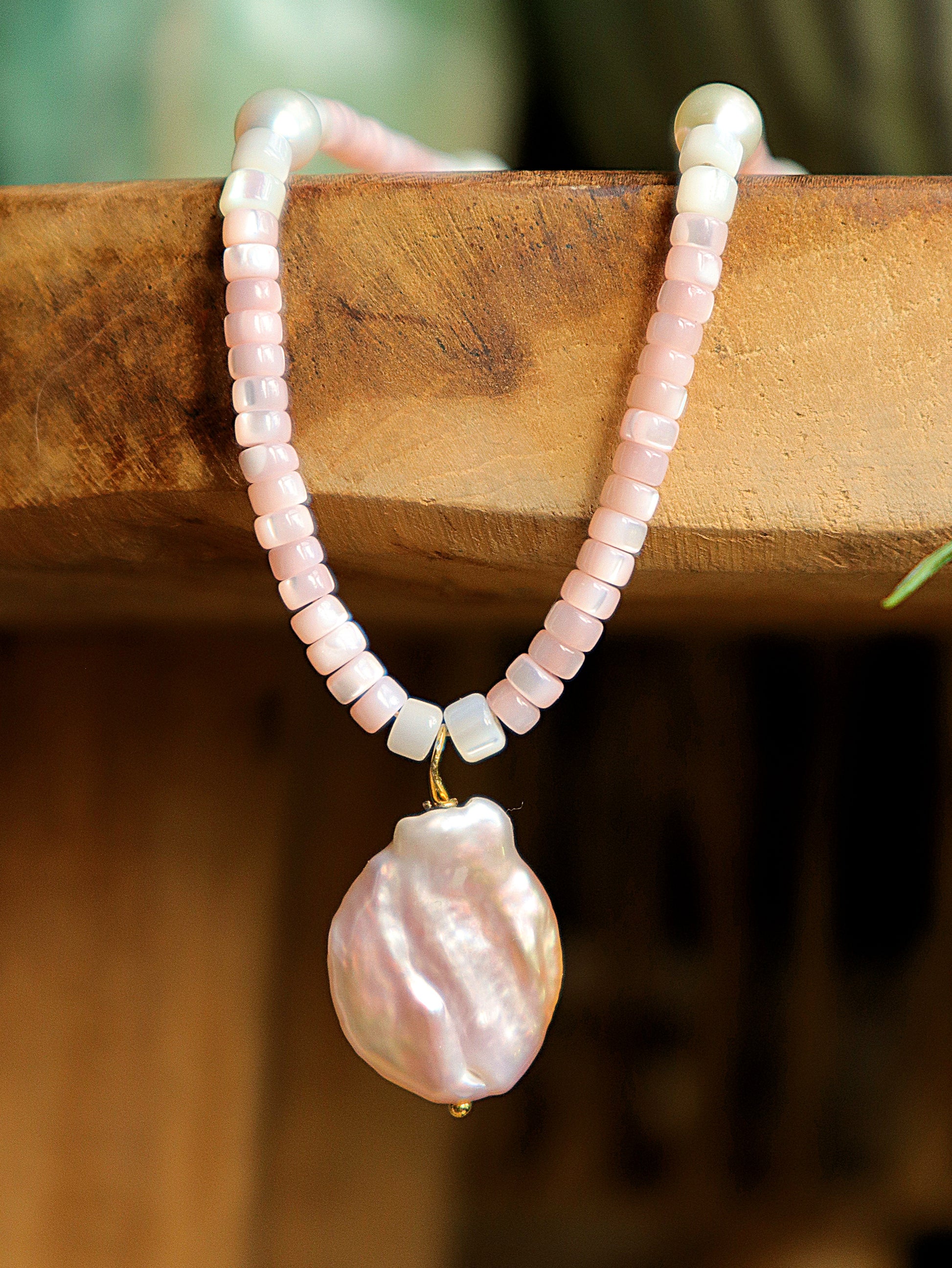 Halskette aus rosè-farbenen Muschelkernperlen, Süßwasserperlen und großem natürlichen Barockperlenanhänger (2 cm), Länge = 43,5 cm + Verlängerungskettchen 5 cm