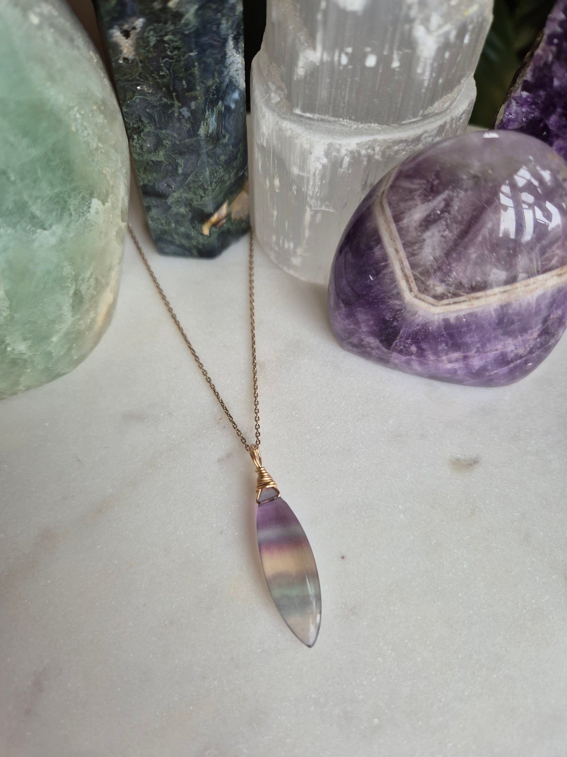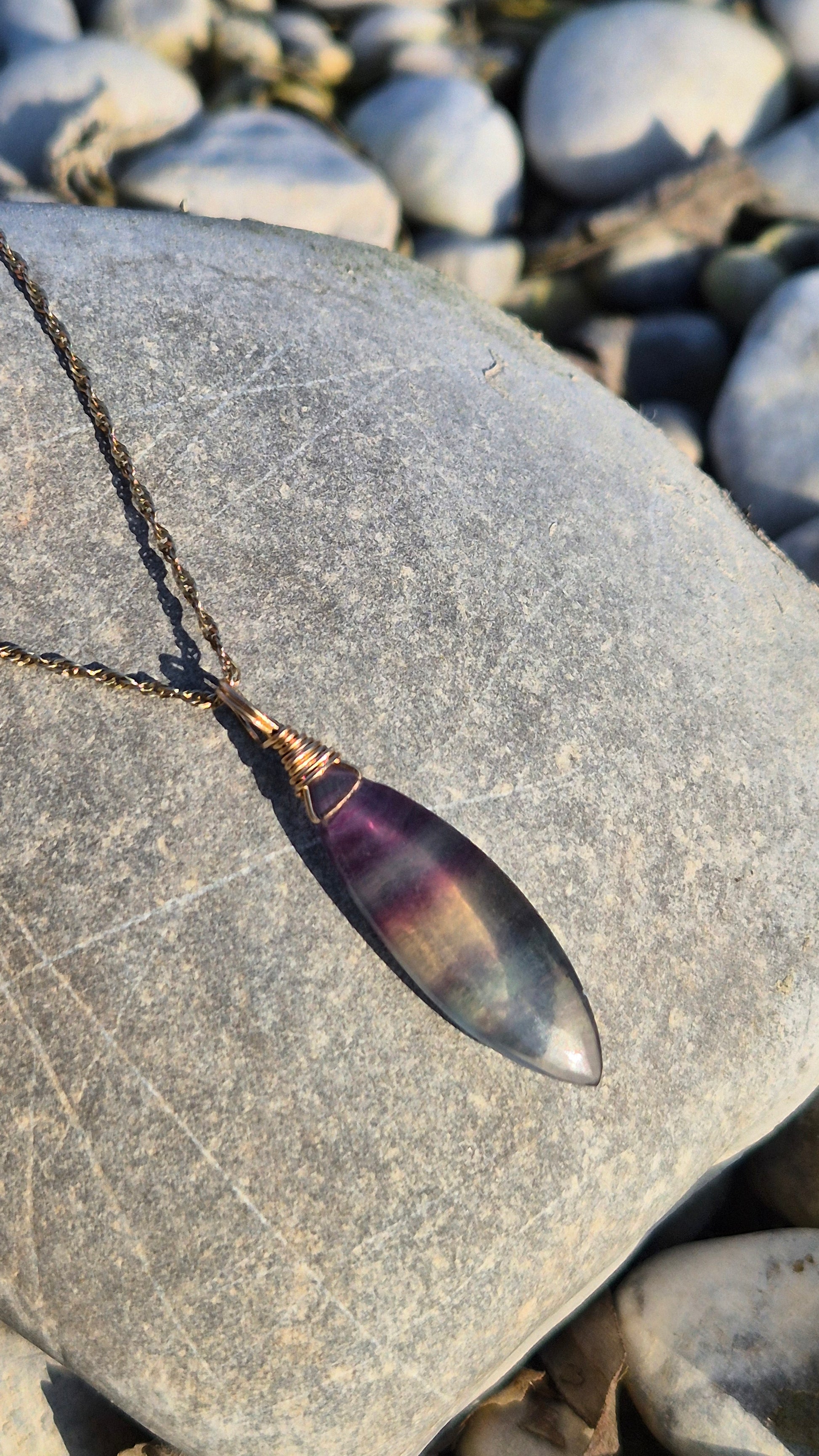Einzigartiger Regenbogen Fluorit Anhänger , ca. 30 mm Länge, 10 mm breit, gewickelt mit (vergoldeten) 925 Sterling Silber Draht und Halskette