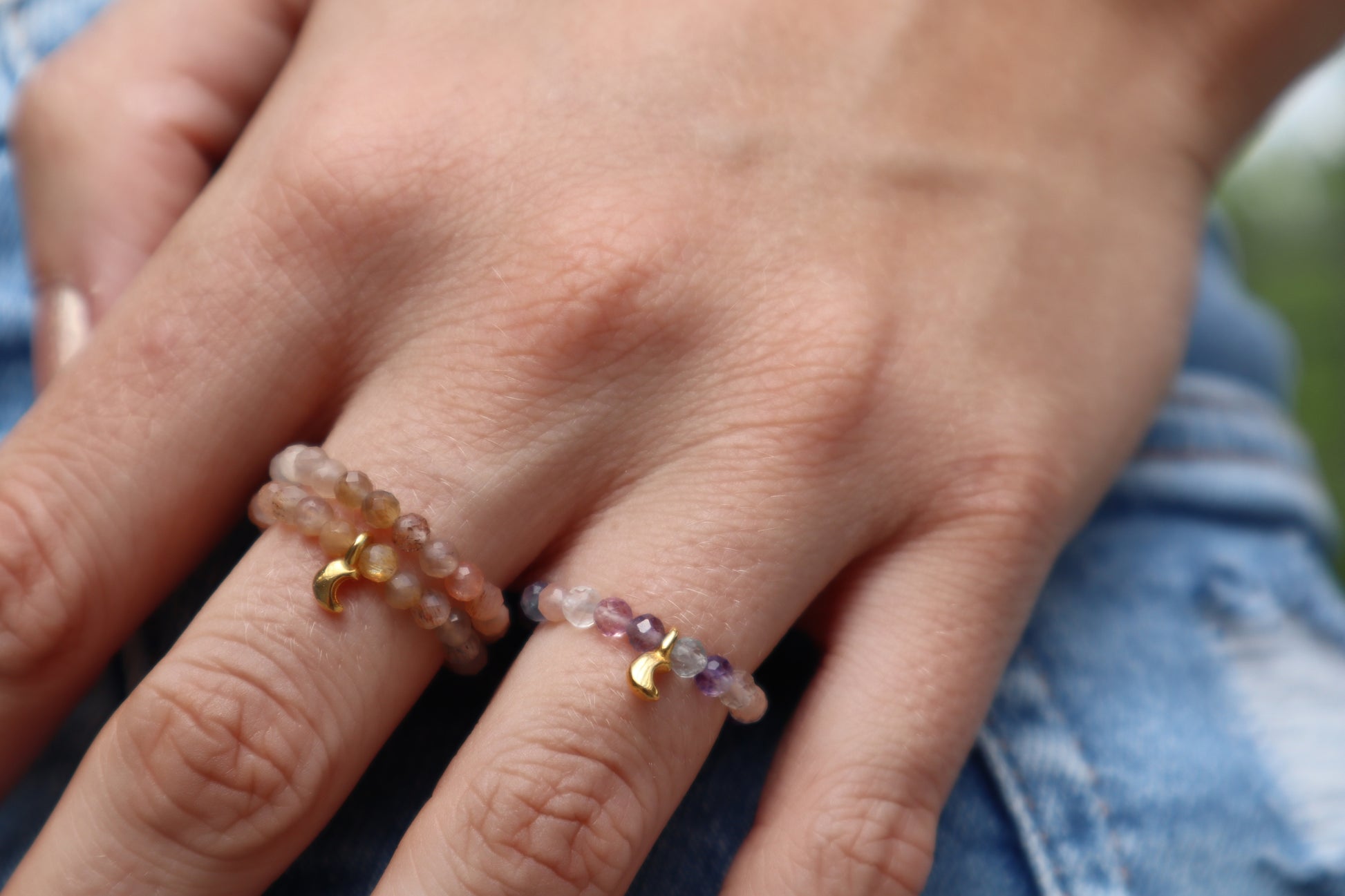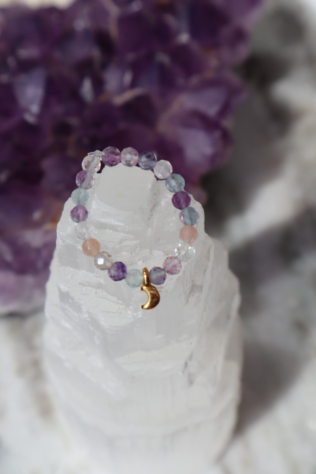 Elastic-Ring aus Regenbogenfluoritperlen und 18k verg. Monanhänger