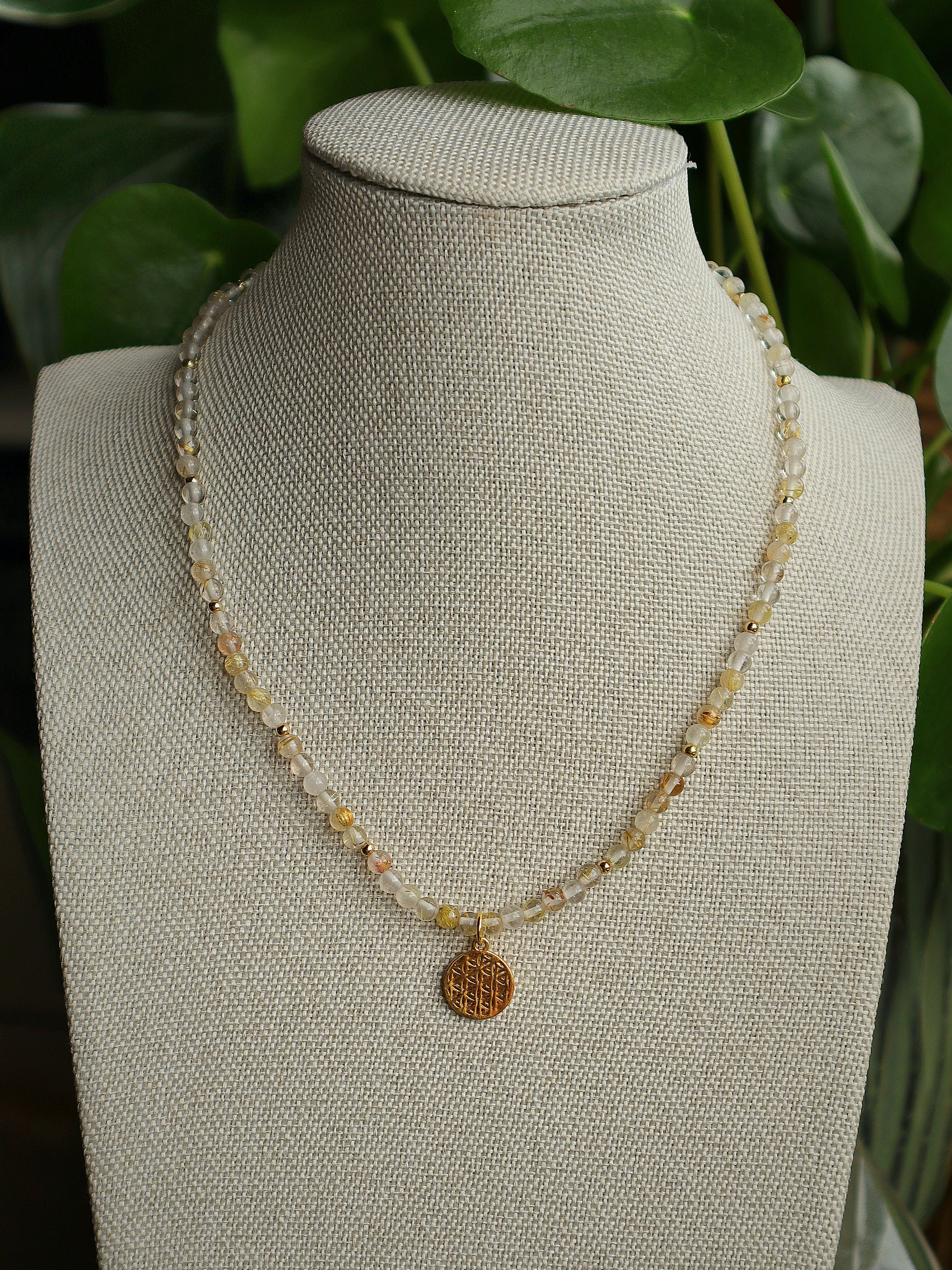 Rutilquarz Kette mit vergoldetem 925 Sterling Silber Blume des Lebens Anhänger und Elementen, Einzelstück, Länge = 40 cm