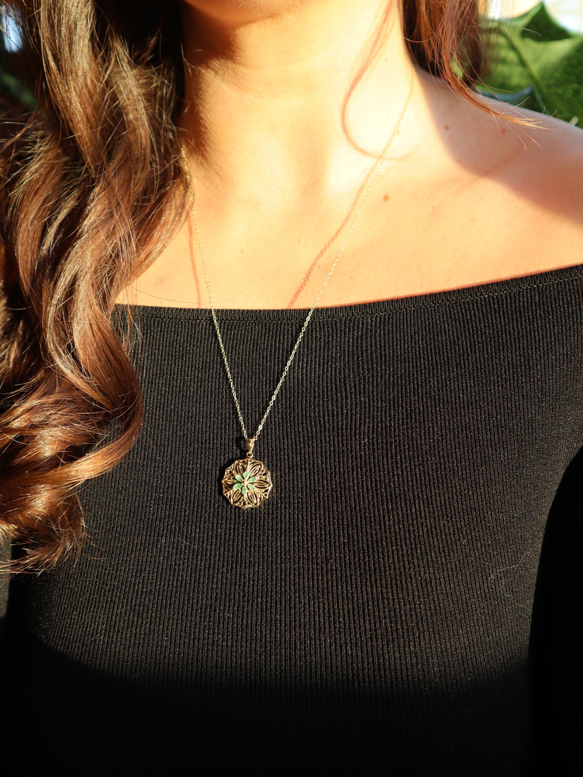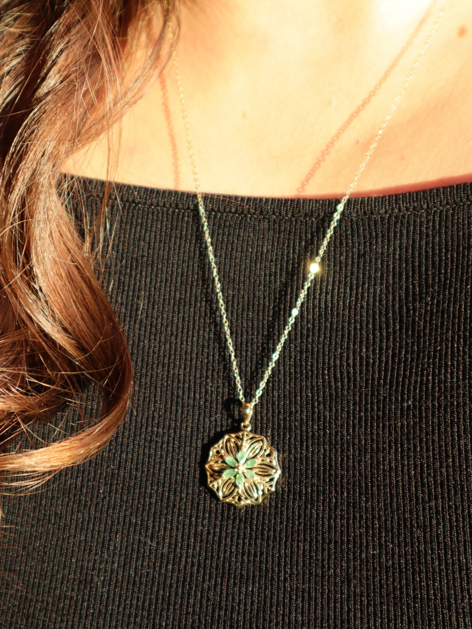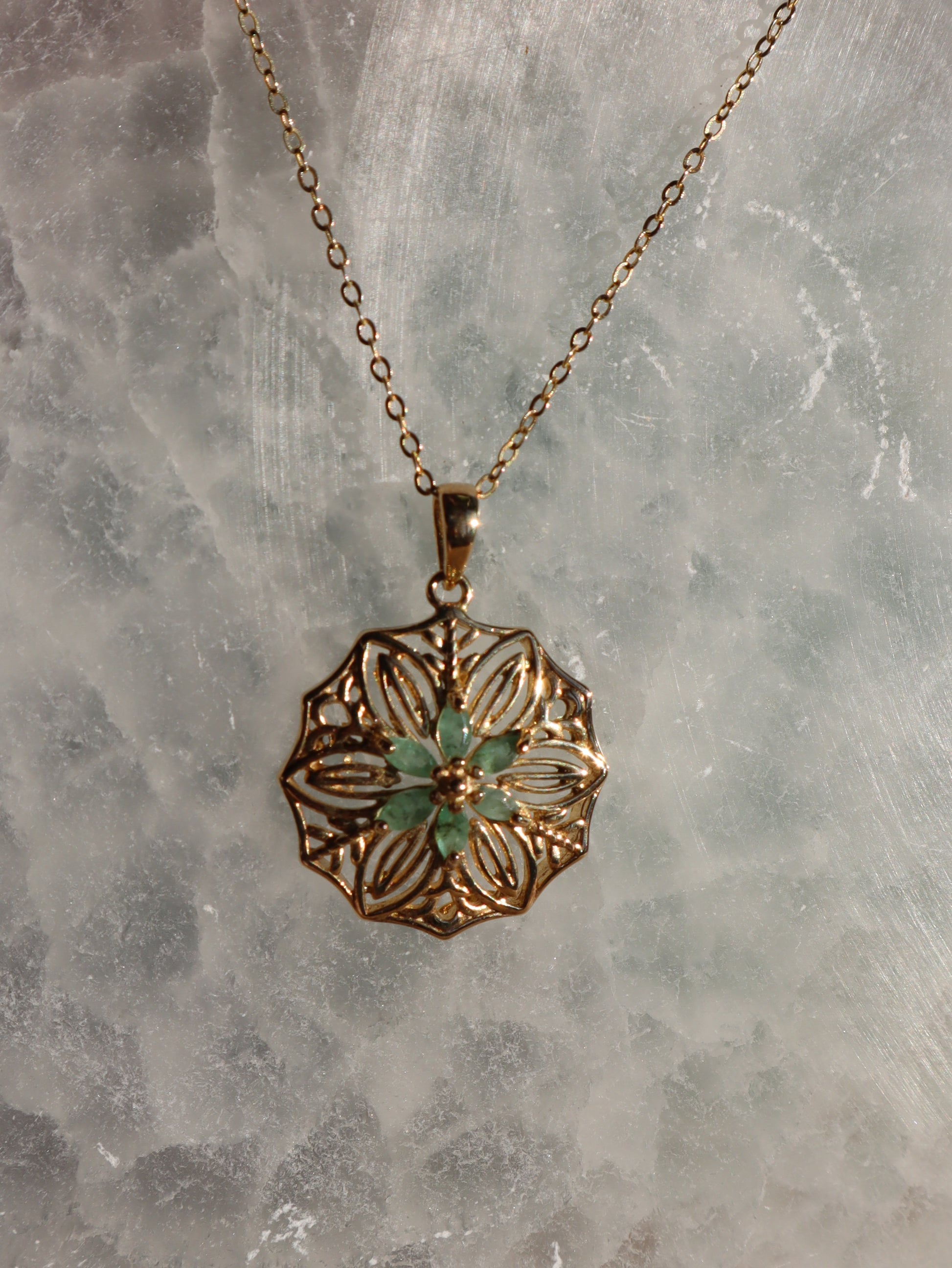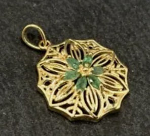Filigraner Anhänger aus vergoldeten 925 Sterling Silber mit Smaragd Blüten, inkl. vergoldeter 925 Sterling Silber Kette, Einzelstück